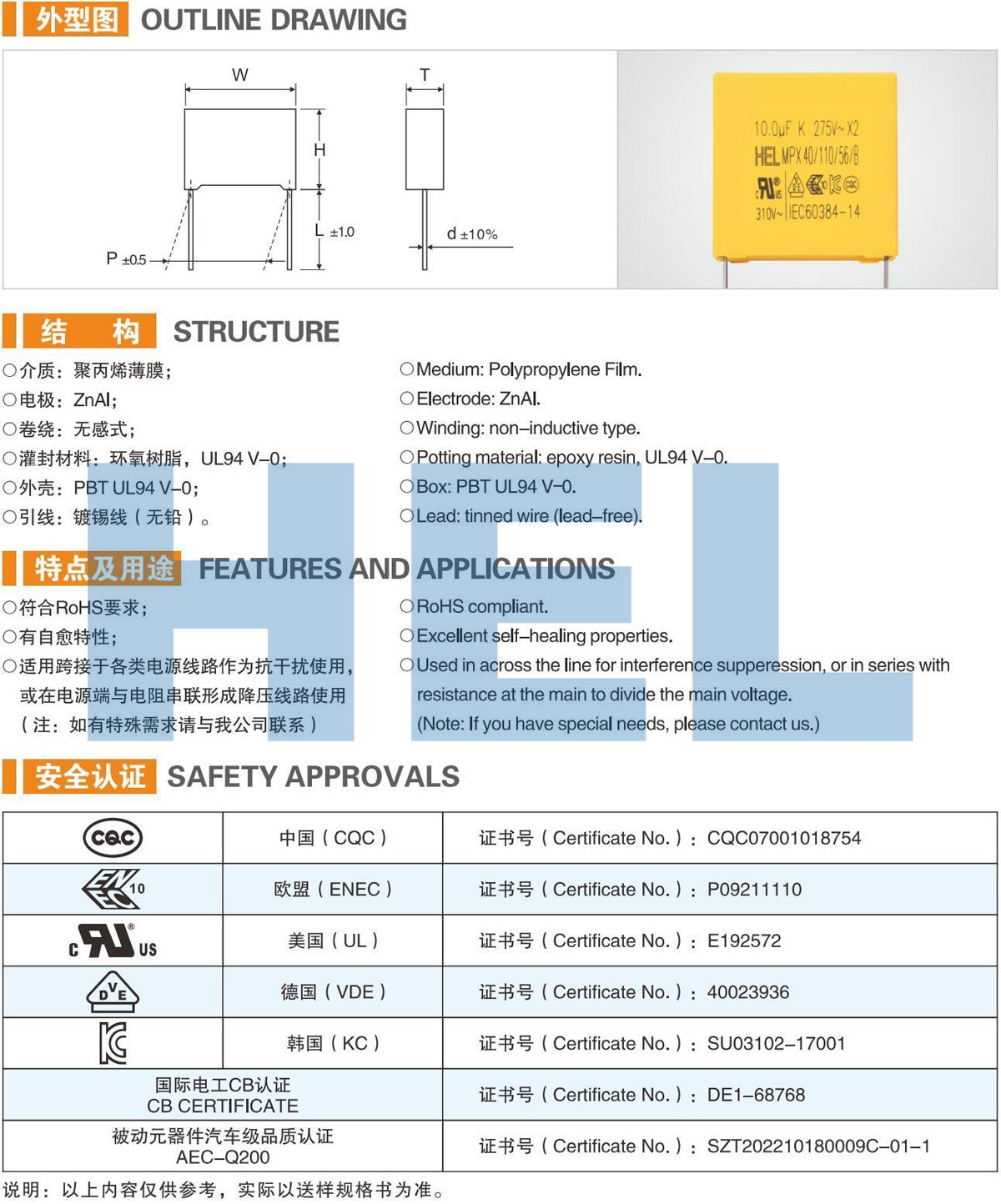 MPX 塑料外殼金屬化聚丙烯薄膜抗干擾電容器(X2)